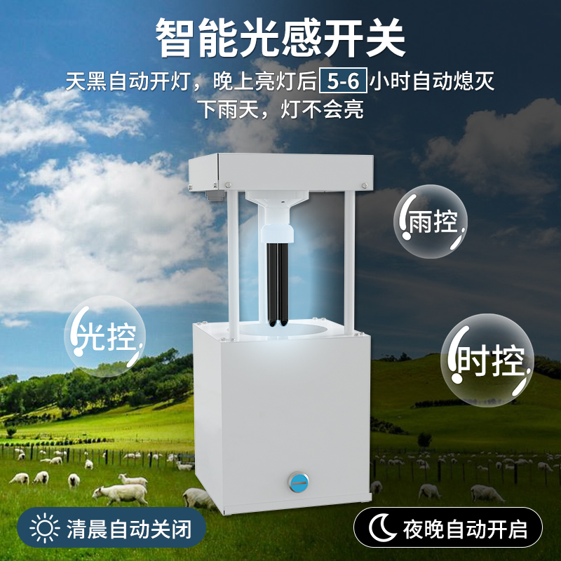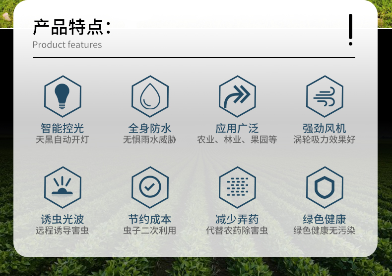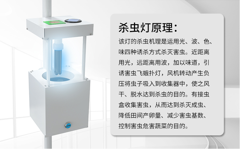 风吸式杀虫灯以太阳能电池板为电源,白天储存电源,晚上为杀虫灯提供电源,供其工作。是一款物理灭虫器械,利用光波引诱害虫成虫扑灯,然后风机转动产生负压气流将虫子吸入到收集器中,使之风干、脱水,达到杀虫的目的。设备由诱虫光源、杀虫部件、集虫部件、支撑部件等组成,具有结构简单、安装方便、可操作性强、杀虫种类多、杀虫范围广、安全环保、无毒的特点。