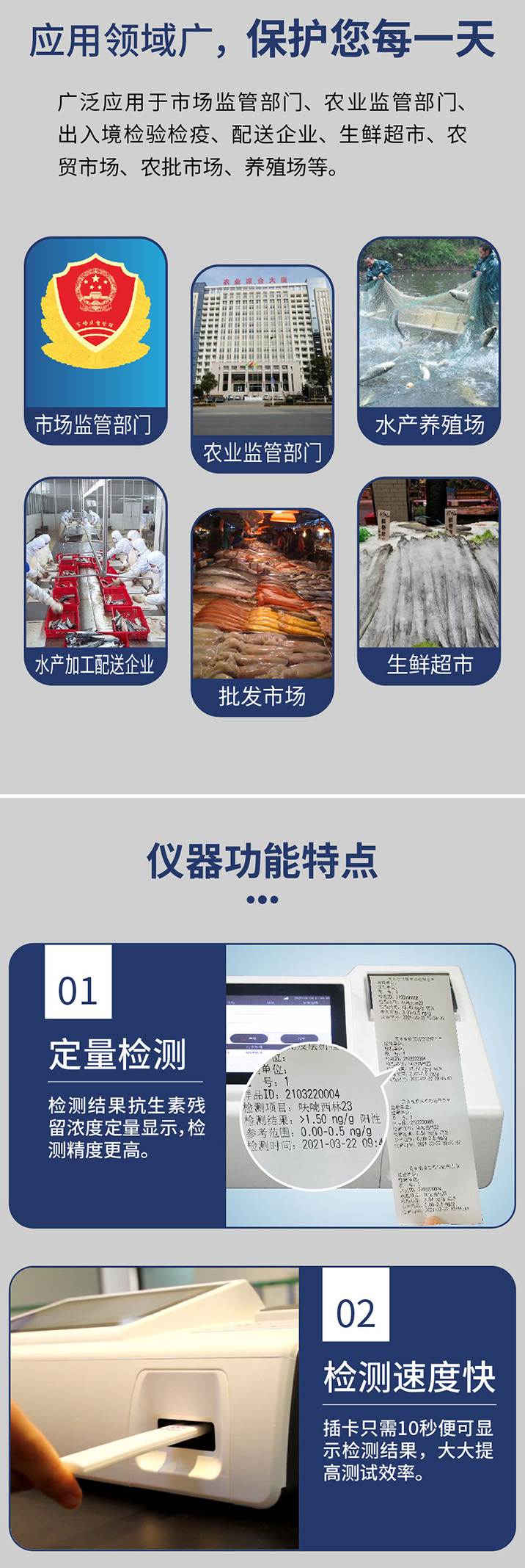 食安科技抗生素荧光定量检测仪适用于快速定量检测畜禽、水产品等样品中的抗生素残留。广泛应用于市场监督管理、水产加工企业、出入境检验、配送企业、生鲜超市、农贸市场、批发市场、养殖场等。