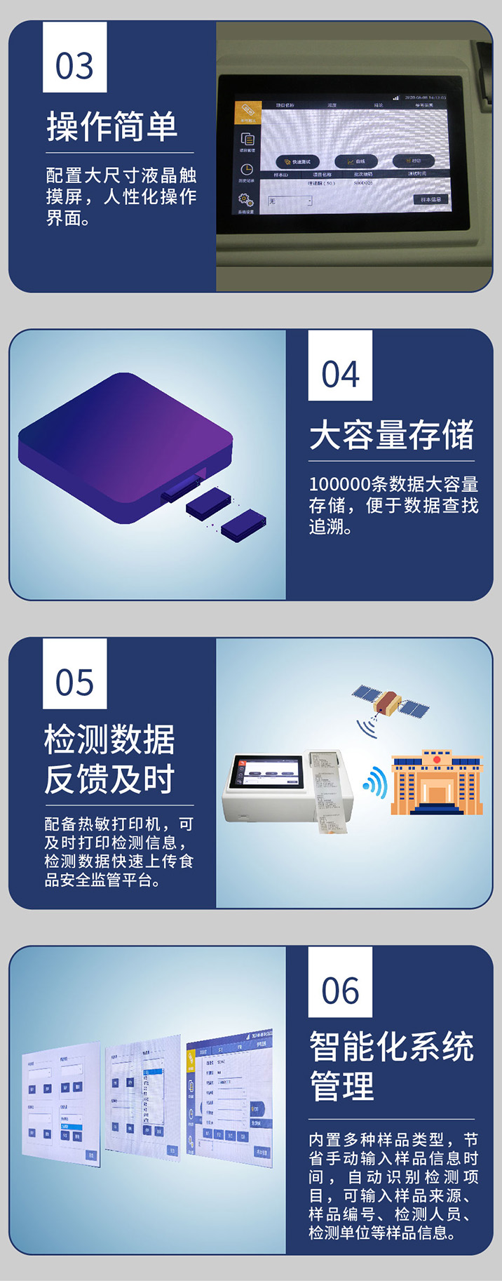 ◇检测数据反馈及时:配备热敏打印机,可及时打印检测信息,检测数据快速上传食品安全监管平台。